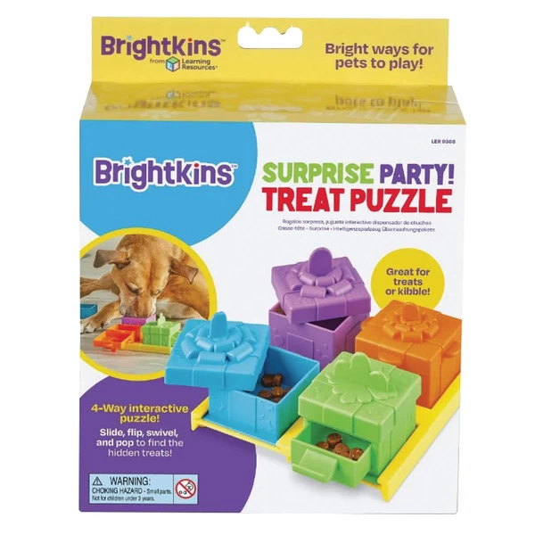 Pup snack their way to mental stimulation when they figure out the treat-filled present challenges in the Surprise Party! Treat Puzzle, one of the fun dog enrichment toys from Brightkins. This dog activity toy’s four colorful presents each opens a different way, so dogs will have to slide, flip, swivel, and pop their way to the tasty treats inside. As they sniff out the treats, dogs will use their snoots to build the beginnings of nosework skills and keep their brains boredom-free with this dog enrichment toy.