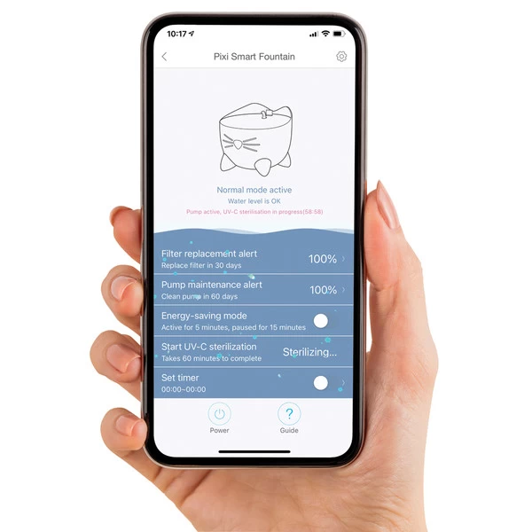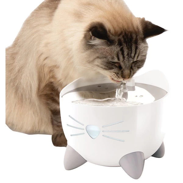 As smart as it is adorable. Cats need access to clean water to stay healthy, as proper hydration can help prevent urinary tract diseases. The Catit PIXI Smart Fountain features two filtration technologies for ultra-clean, great-tasting water. UV-C sterilization neutralizes 99% of bacteria and viruses and the triple action filter softens water and removes debris. Ergonomic drinking options to help cats drink comfortably, reduces stress on whiskers with large, high-grade stainless-steel top. PIXI nose keeps you updated on low water level and filter status, and acts as nightlight. White = Nightlight; Steady Blue = UV-C sterilization active, Blinking Blue = Replace filter; Blinking Red = Time to refill, Steady Red = Out of water, auto-shutdown. While wear and tear can cause most pumps to grow noisier over time, ours has a durable ceramic bearing that will keep it running smoothly and silently for longer. Can be controlled via free mobile PIXI app.
