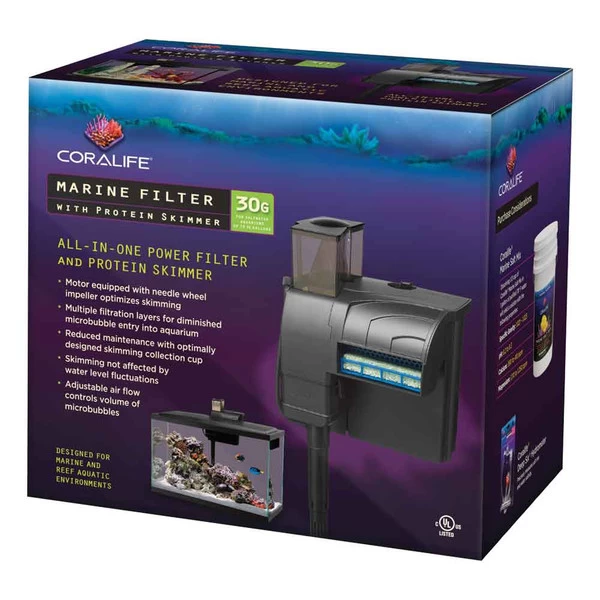 The first power filter designed specifically for use in a saltwater enviroment! Coralife’s marine filter includes a built-in protein skimmer with needle-wheel impeller to remove additional dissolved organics from your tank. Adjustable air flow dial controls the intensity of the skimming bubbles. Convenient hang-on design eliminates the need for large storage compartments around your tank. The power filter also provides efficient 3 stage filtration – biological, chemical and mechanical for keeping your saltwater tank happy and health.