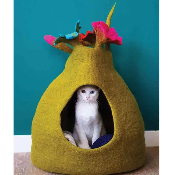 The copyrighted Bouquet Cave is approximately 16″ in diameter and 20″ tall and is comfortable for most cats and some toy dog breeds, up to 15 lbs.