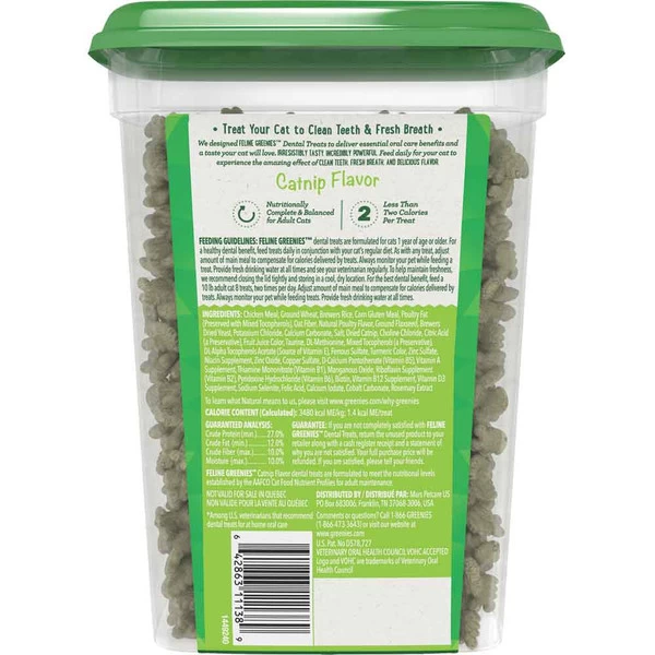 Oral health issues are the most common health problems diagnosed in adult pets.** FELINE GREENIES Dental Treats have a specially formulated crunchy texture that is designed to reduce tartar buildup. Plus, with an irresistible taste, they are sure to stir up purrs of joy. These treats are nutritionally complete and balanced for adult cats, and at less than 2 calories per treat, they’re designed for daily treating. Cat dental care has never been easier — or more delicious. Treat your cat to clean teeth and fresh breath!