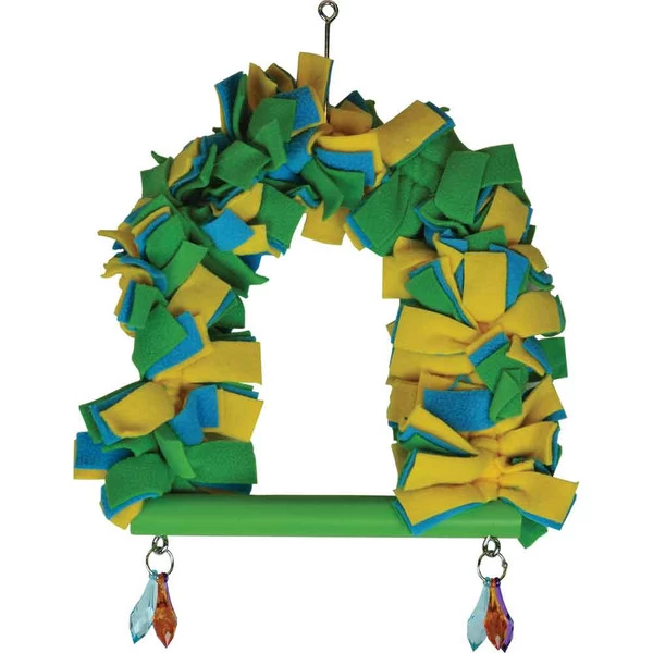 Fun hanging fleece bird toy will be lots of fun for your smaller bird pet. 7 in. width and 7.5 in. high.