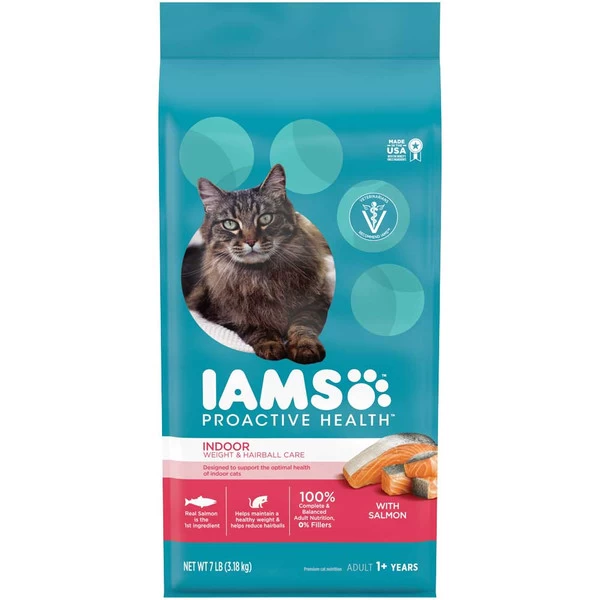 Your cat is unique that’s why IAMS makes a cat food that’s just as unique as they are. Help keep your cats at their best with IAMS PROACTIVE HEALTH Adult Indoor Weight & Hairball Care Dry Cat Food with Salmon. This kibble recipe is designed to provide your cat with the nutrients they need and assist with weight management and hairball control. Help your cat sustain a healthy weight with this unique formula, without the loss of flavor. Made with L-carnitine, it helps burn fat and maintain a healthy metabolism. It features a proprietary fiber blend including beet pulp that can help control hairballs. This cat food formula contains the optimal omega 6:3 fatty acid ratio to help your kitty grow and maintain a soft, shiny coat, with real salmon as the first ingredient. This formula is full of essential vitamins and nutrients, including vitamin E to help maintain a strong immune system. Plus, it nourishes heart health with calcium and potassium. Your cat will be eager to get their paws on this purr-fect fish cat food formula, and you can rest easy knowing you’re feeding them a meal that contributes to healthy nutrition.