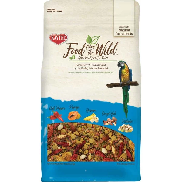 Ground Corn; Ground Rice; Dried Banana; Dried Pineapple; Pistachios; Dried Papaya; Corn Gluten Meal; Soybean Meal; Almonds; Shelled Brazil Nuts; Ground Green Peas; Hazelnuts; Dried Peppers; Soybean Oil; Calendula; Alfalfa Nutrient Concentrate; Dicalcium Phosphate; Calcium Carbonate; Ground Flax Seed (Source of Omega-3); Wheat Middlings; L-Lysine; Salt; Ground Wheat; Dried Whole Egg; Dried Molasses Beet Pulp; Annatto Extract (Color); Vitamin A Supplement; Choline Chloride; Wheat Germ Meal; Fructooligosaccharide; DL-Methionine; Brewers Dried Yeast; Dextrose; Suncured Alfalfa Meal; Mixed Tocopherols (Preservative); Vitamin E Supplement; Vitamin B12 Supplement; Riboflavin Supplement; Yeast Extract; Ferrous Sulfate; Vegetable Juice (Color); Yucca Schidigera Extract; Zinc Oxide; Manganous Oxide; Menadione Sodium Bisulfite Complex (Source of Vitamin K activity); Niacin; Beta-Carotene (Color); Rosemary Extract; Citric Acid; Calcium Pantothenate; Copper Sulfate; Thiamine Mononitrate; Pyridoxine Hydrochloride; Manganese Proteinate; Copper Proteinate; Folic Acid; Cholecalciferol (Source of Vitamin D3); Calcium Iodate; Biotin; Cobalt Carbonate; Sodium Selenite; Dried Bacillus Licheniformis Fermentation Product; Dried Bacillus Subtilis Fermentation Product.