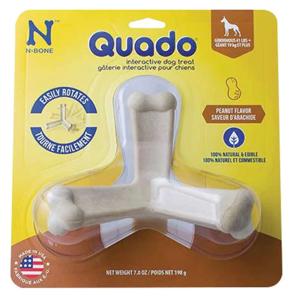 The unique “quad” design makes it easy for your canine pal to hold, chew, and play. Quado also helps remove plaque and tartar as your dog chews, while delicious peanut flavor entices and peppermint helps freshen breath. Its great for oral health! Quado is not made with any plastic, nylon or rubber and is completely edible. Keep your dog entertained and help curb destructive chewing behaviors with this unique interactive treat!