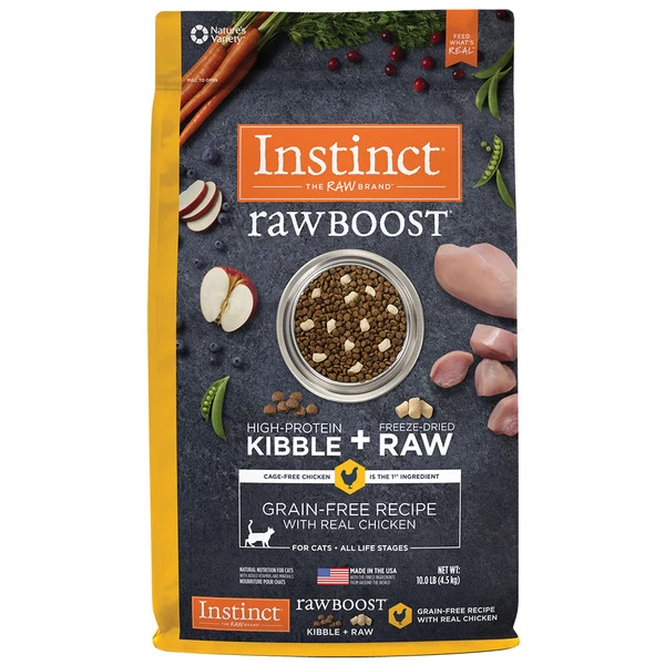 High animal-protein, grain-free, boosted nutrition with bites of freeze-dried raw meat, Instinct Raw Boost Grain-Free Recipe with Real Chicken is a better way to feed kibble. Unlock your cat’s potential to thrive and put more of the pure, real nutrition of raw into every bowl.