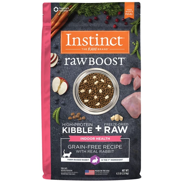 High animal-protein, grain-free, boosted nutrition with bites of freeze-dried raw meat, Instinct Raw Boost Grain-Free Recipe with Real Rabbit for Indoor Health is a better way to feed kibble. Unlock your cat’s potential to thrive and put more of the pure, real nutrition of raw into every bowl.