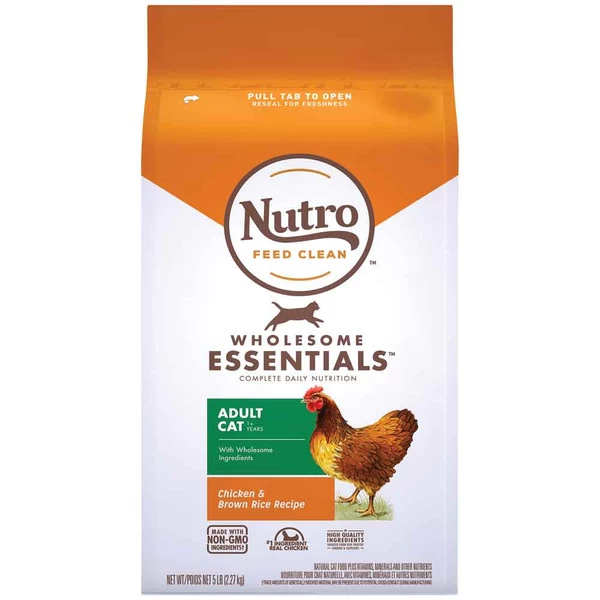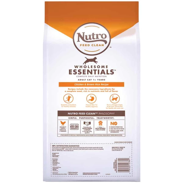 Each NUTRO WHOLESOME ESSENTIALS Dry Cat Food recipe starts with a high-quality protein source and is made with non-GMO ingredients.* This cat food features real chicken as the #1 ingredient, natural fiber for healthy digestion, and essential antioxidants for a healthy immune system. This kibble is also rich in omega 6 fatty acids to support healthy skin and a soft, shiny coat. NUTRO Dry Cat Foods are made with quality ingredients carefully sourced from a trusted network of farmers and suppliers and have no corn, wheat, or soy protein, no chicken by-product meal, and no artificial preservatives, flavors, or colors. Give your adult cat a complete, nutritious meal every time with NUTRO WHOLESOME ESSENTIALS Adult Cat Natural Dry Cat Food Plus Vitamins, Minerals & Other Nutrients. * Trace amounts of genetically modified material may be present due to potential cross-contact during manufacturing.