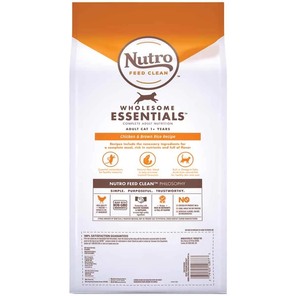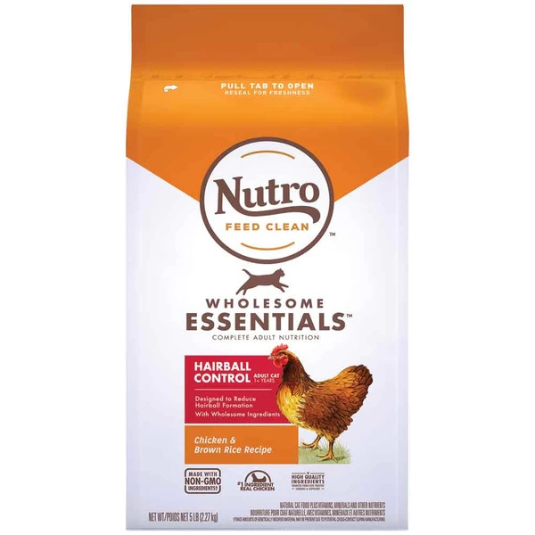 NUTRO WHOLESOME ESSENTIALS Hairball Control Cat Food is designed to help reduce hairball formation and promote digestive health in adult cats. This dry recipe is made with non-GMO* ingredients and features real chicken as the #1 ingredient, a natural fiber blend to minimize hairball formation, and essential antioxidants for a healthy immune system. This adult dry cat food is also crafted with omega 6 fatty acids to promote healthy skin and a soft, shiny coat. NUTRO Dry Cat Foods are made with quality ingredients carefully sourced from a trusted network of farmers and suppliers and have no corn, wheat, or soy protein, no chicken by-product meal, and no artificial preservatives, flavors, or colors. Give your adult cat a complete, nutritious meal that helps minimize hairball formation with NUTRO WHOLESOME ESSENTIALS Hairball Control Adult Cat Dry Food. * Trace amounts of genetically modified material may be present due to potential cross-contact during manufacturing.