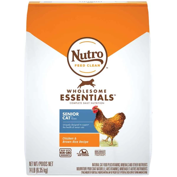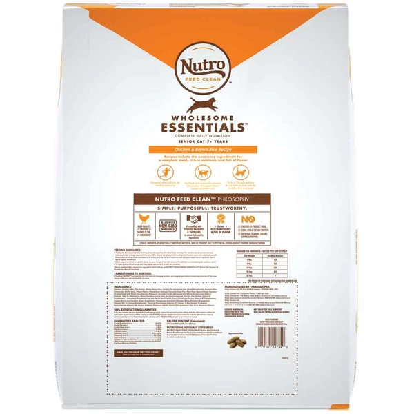 Each NUTRO WHOLESOME ESSENTIALS Dry Cat Food recipe starts with a high-quality protein source and is made with non-GMO ingredients.* This premium natural cat food features real chicken as the #1 ingredient and has essential nutrients like taurine to support heart health in aging cats. It is also rich in omega-6 fatty acids for skin care and coat health. NUTRO Dry Cat Foods are made with quality ingredients carefully sourced from a trusted network of farmers and suppliers and have no corn, wheat, or soy protein, no chicken by-product meal, and no artificial preservatives, flavors, or colors. Give your senior cat a complete, nutritious meal every time with NUTRO WHOLESOME ESSENTIALS Senior Cat Dry Cat Food. * Trace amounts of genetically modified material may be present due to potential cross-contact during manufacturing.