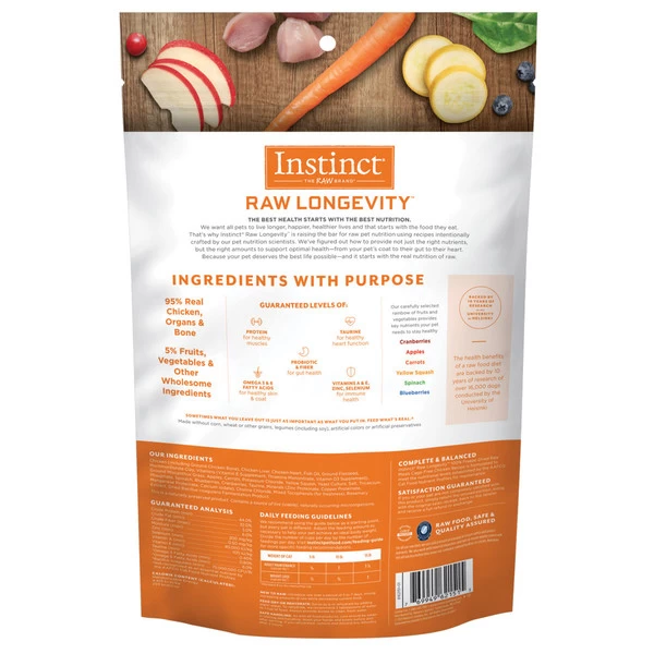95% real chicken, organs and bone and 5% vegetables, fruits and other wholesome ingredients.