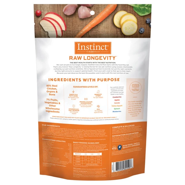 93% real chicken, organs and bone and 7% vegetables, fruits and other wholesome ingredients.