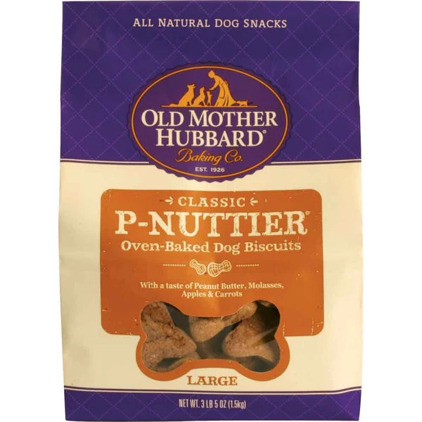 Old Mother Hubbard Classic P-Nuttier Biscuits satisfy your dog with delicious and nutritious all natural ingredients. Made with crunchy peanut butter, cane molasses, apples, carrots, eggs and more. Contains no artificial ingredients.