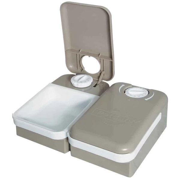 A trusty, reliable automatic feeder pet parents can rely on to feed their pets portion-controlled meals daily! Petsafe’s two meal feeder programmatically dispenses food on schedule. Program 2 meals within a one to 99 hour time span. Sleed-design looks great. Ideal for cats or smaller dogs, each compartment holds up to 1.5 cups of food. Dishwasher-safe and BPA-free plastic. Requires 4 AA batteries, not included.