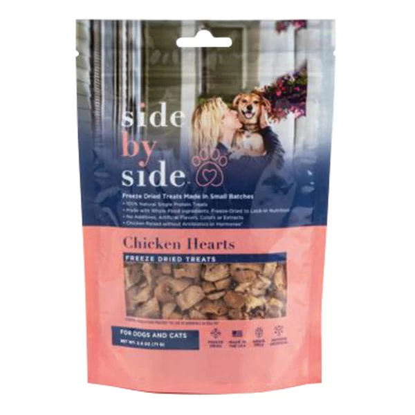 Treat your doggie dude to a true delicacy with Side By Side Warming Whole Chicken Hearts. These freeze-dried, single-protein dog treats are crafted as tasty, low-calorie training tools rooted in Eastern Food Therapy principles and all natural, whole food ingredients. Whole chicken hearts—rich in taurine, glucosamine and chondroitin—are gently cooked without any antibiotics, hormones, additives, artificial flavors, colors or extracts. These high-quality, low-fat dog treats are designed to support heart, immune and digestive health so your furry buddy can keep living his best life for a long time to come.