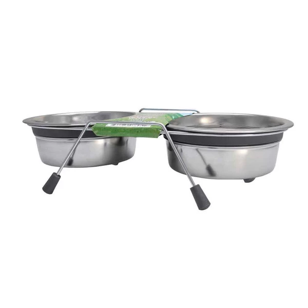 Enjoy blissful silence as your dog dines from Loving Pets raised Silent Double Diner. This patent pending elevated bowl set features sound deadening rubber rings around veterinarian recommended stainless steel bowls. The stainless steel stand uses skid-free rubber feet to eliminate noise and prevent sliding and spilling. The color coordinated rubber rings and feet are removable, making the diner completely dishwasher safe.