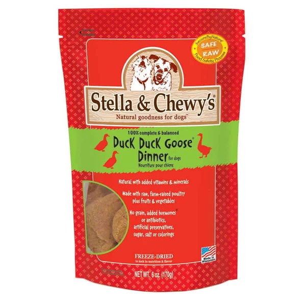 Stella & Chewy’s Duck Duck Goose Dinner is the perfect freeze-dried balanced meal solution for your favorite dog! Made with 95% poultry, nutrient rich organs and bone, the menu includes organic fruits and vegetables along with vitamins, minerals, probiotics and anti-oxidants…everything your dog needs to eat healthy and stay happy! Contains no added hormones or anti-biotics and is completely free of any grain, filler, gluten or artificial preservatives or colors.