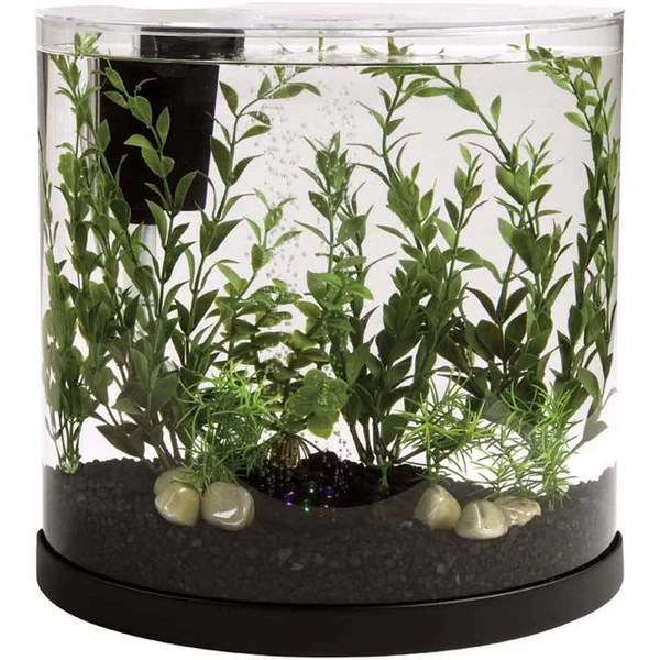 Tetra Bubbling LED Half-moon Aquarium Kit makes an attractive accent to any decor. Includes 3 gallon half moon tank, clear lid with feeding hole, auto color changing three LED air stone, Tetra internal filter, filter cartridge, Tetra air pump, airline tubing and an airline connector valve.