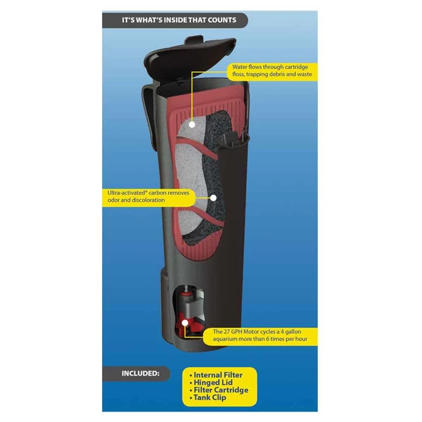 Designed for tanks up to 4 gallons, Tetra’s Whisper 4i internal aquarium filter is ideal for smaller aquariums in need of superior filtration and quiet operation. Designed to adjust easily to low or high water levels, the 27GPH pump circulates a 4 gallon aquarium more than 6 times an hour. Two-filter design Whisper cartridge floss catches debris and waste, while ultra-activated carbon takes out smells and any discoloration. Space-saving design can be mounted inside your aquarium, flush to your tank’s wall. Includes lid, tank clip, filter and cartridge. Requires Small Whisper filter cartridges.
