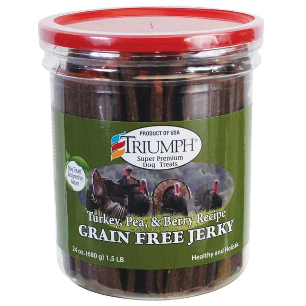 Triumph Grain Free Jerky is a tasty treat that any dog will love. Completely grain free, the treats are formulated to help your dog avoid any allergen concerns it might find in other treats. Contains all natural ingredients, including turkey!