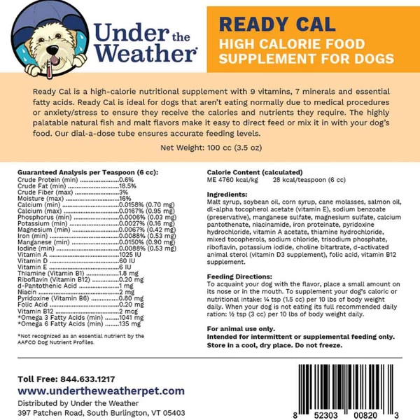 Ready Cal is a high-calorie nutritional supplement for dogs. Dogs love the highly palatable natural fish and malt flavors, making it easy to direct feed or mix it in with your dog’s food. Contains 9 vitamins, 7 minerals and essential fatty acids. Ready Cal is ideal for dogs that aren’t eating normally due to medical procedures or anxiety/stress to ensure they receive the calories and nutrients they require. Dial-a-dose tube ensures accurate feeding levels.