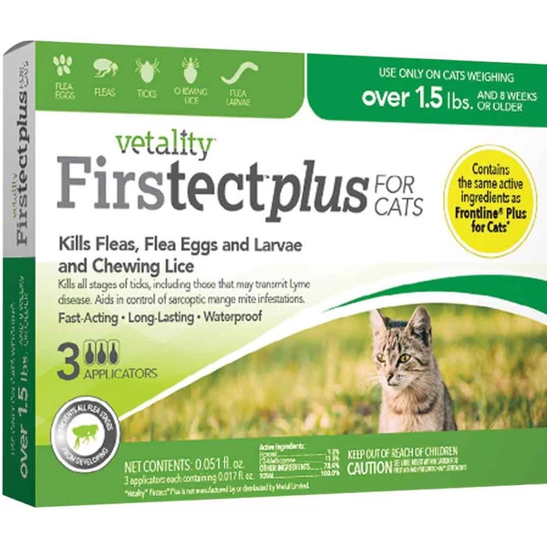 Vetality Firstect Plus offers vet quality protection from fleas and ticks and prevents all flea stages from developing. Vetality Firstect Plus topicals eliminate fleas, flea eggs, ticks and lice. These vet-quality topicals contain the same active ingredients (fipronil + (S)-methoprene) as leading vet brand, FRONTLINE Plus for dogs but cost less. Use only on dogs 8 weeks and older. Each application lasts approximately one month.
