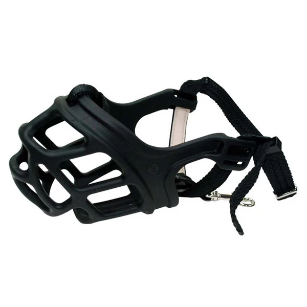 Keep your Dog under control and on good behavior with the Zeus Alpha Dog Muzzle. The Alpha Dog Muzzle helps to control biting, barking, and chewing while still allowing your dog to drink, pant, and accept treats. These muzzles are made from tough, flexible thermo plastic rubber. The basket like shape has large openings allowing air to flow through and prevent overheating. The head and neck straps are easy to put on and are adjustable to fit your dog’s needs. The muzzle also features a safety hook which loops onto your dog’s collar ensuring that the muzzle stays put. Top length: 2.7 in. Bottom length: 4.2 in. Circumference: 11.8 in.