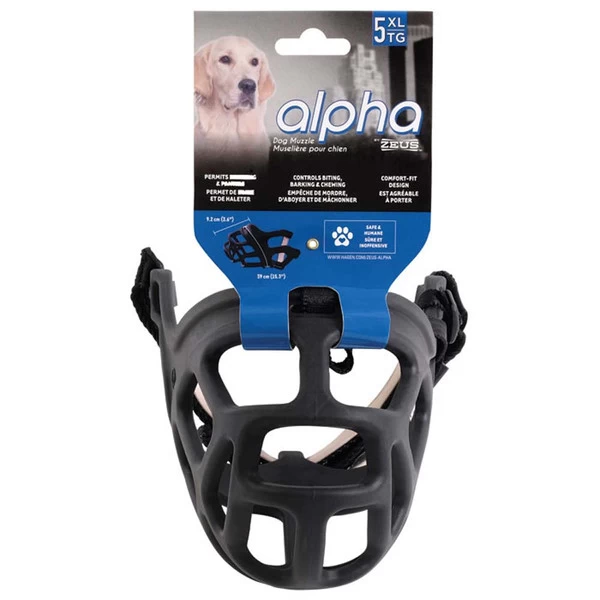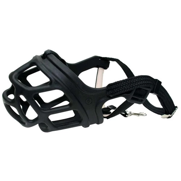 Keep your Dog under control and on good behavior with the Zeus Alpha Dog Muzzle. The Alpha Dog Muzzle helps to control biting, barking, and chewing while still allowing your dog to drink, pant, and accept treats. These muzzles are made from tough, flexible thermo plastic rubber. The basket like shape has large openings allowing air to flow through and prevent overheating. The head and neck straps are easy to put on and are adjustable to fit your dog’s needs. The muzzle also features a safety hook which loops onto your dog’s collar ensuring that the muzzle stays put. Top length: 3.6 in. Bottom length: 5.7 in. Circumference: 15.3 in.