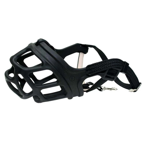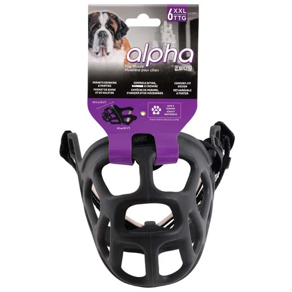 Keep your Dog under control and on good behavior with the Zeus Alpha Dog Muzzle. The Alpha Dog Muzzle helps to control biting, barking, and chewing while still allowing your dog to drink, pant, and accept treats. These muzzles are made from tough, flexible thermo plastic rubber. The basket like shape has large openings allowing air to flow through and prevent overheating. The head and neck straps are easy to put on and are adjustable to fit your dog’s needs. The muzzle also features a safety hook which loops onto your dog’s collar ensuring that the muzzle stays put. Top length: 4.1 in. Bottom length: 6 in. Circumference: 17.1 in.